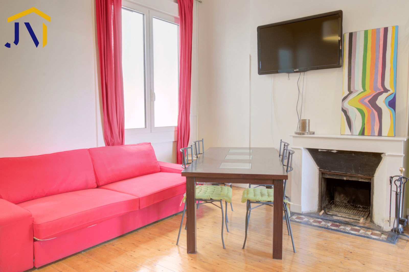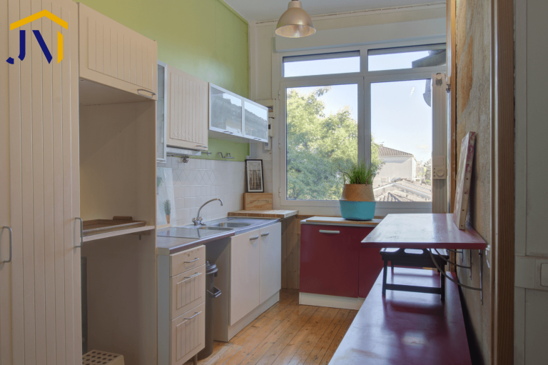 L'appartement est traversant, il comprend une cuisine ouverte sur le séjour avec cheminée, parquet massif et une grande hauteur sous plafond. Il dispose également d'une première chambre d'environ 13m², une deuxième chambre très lumineuse de 19 m², une salle de bain et wc séparé.